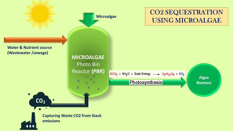 Open ponds and closed photo-bioreactor (PBR) are the two ways of sequestering CO2 using algae, which are currently being developed and used. Since open systems require large area to operate efficiently, technology is more focused on developing closed systems like photo-bioreactor (PBR), where the optimum conditions to grow algae and sequester CO2 can be maintained and controlled easily. Few species of microalgae have been identified that use CO2 efficiently because they can grow rapidly and can be readily incorporated into engineered systems, such as PBR.