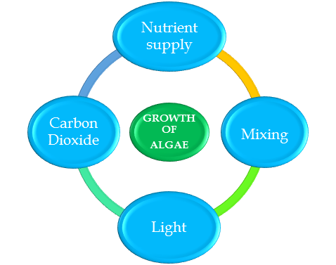 Algae, a diverse group of simple photoautotrophic organisms, which possess chlorophyll to manufacture their own food through photosynthesis. Algae have very high photosynthetic yields, where 3-8% of solar energy can be converted to biomass, whereas observed yields for terrestrial plants are about 0 .5%. Specifically, algae are capable of utilizing atmospheric CO 2 and nutrients present in water bodies in the presence of light for their growth. Algae are rich in protein and lipid content and can be processed to produce pharmaceutical products and bio-fuel.